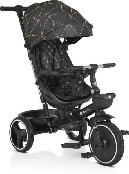 1-5 éves korú és legfeljebb 25 kg súlyú gyermekek számára. PU kerekek - elöl 12', hátul 10'. Első kerék szabadkerék funkcióval - az első kerék körbe mozoghat, de a pedálok rögzítettek, és a pedálok nem tudják irányítani a kereket. Állítható szülői tolókar, amely az első kerék mozgásának irányát szabályozza. Összecsukható kormány; 2 lábtartóval - egy a kisebb és egy a nagyobb gyermekek számára. Állítható tető; 360°-ban forgatható ülés; Háttámla - több fekvőhelyzetbe dönthető; Puha biztonsági sávval; levehető üléspárnával, 3 pontos biztonsági övekkel, 2 hátsó fékkel.