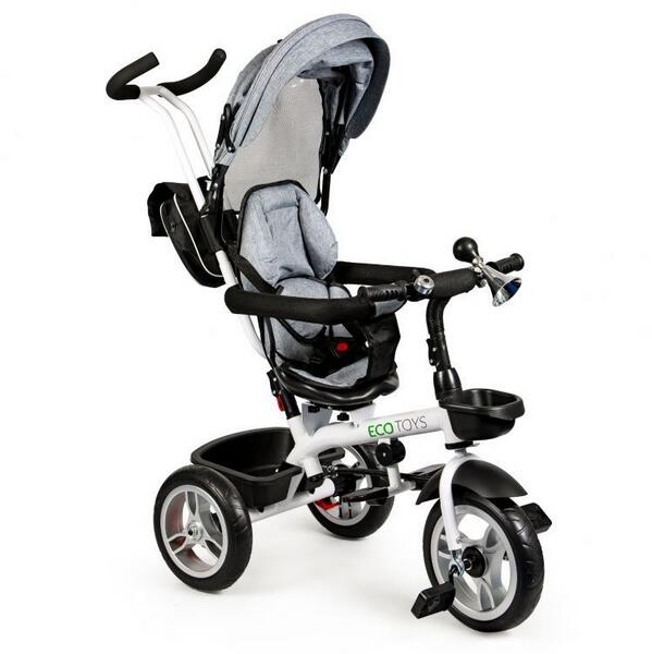 A kicsi kényelme már nem fog gondot okozni, mert erről a tricikli hátulját és az ülését is eltakaró puha huzat gondoskodik. A tricikli 12 hónapos kortól 5 éves korig használható, maximum 25 kg-os gyermeksúlyig. A kompakt és könnyen használható tricikli rendelkezik: acélvázzal, összecsukható napellenzővel, összecsukható lábakkal, tartós EVA hab kerekekkel, állítható magasságú kormányrúddal, fékekkel és sárvédőkkel, védőkorlátokkal, összecsukható napellenzővel, amely megvédi Önt az esőtől és a napsütéstől, így ötvözi a kiváló minőségű anyagokat   a legújabb technológiákkal a triciklik területén. BIZTONSÁGI ÖVEK – 5 RÖGZÍTÉSI PONT A kicsi mindig biztonságban lesz az 5 pontban záródó öveknek és a védőgyűrűnek köszönhetően   ami nem engedi, hogy a gyermek leessen a tricikliről. Az övek 5 zárási pontja biztosítja a biztonságot és a helyes pozíciót használat közben. KÉNYELEM ÉS VÉDELEM A kiegészítő párnák növelik az utazás kényelmét, és megakadályozzák a gyermek érzékeny bőrének súrlódását utazás közben. Az összecsukható napernyő megvédi a gyermeket a széltől, az esőtől és a napsütéstől. KÉNYELMES LÁBHELYZET A lábtartó   a gyermek számára lehetővé teszi, hogy séta közben pihentesse a lábát, így kényelmes testhelyzetet kínál. csúszásmentes fogantyúk A keret dudával és csúszásmentes gumi fogantyúkkal van kiegészítve, amelyek gondoskodnak gyermeke biztonságáról és megakadályozzák a kezek véletlen elcsúszását. SPECIÁLIS FÉK A hátsó kerekek speciális fékkel rendelkeznek, hasonlóan a babakocsiknál használthoz. A blokkolása miatt a kerekek nem forognak, és maga a kerékpár álló helyzetben marad. ÁRUKTÁROLÓ HELYEK A tricikli szállítófogantyúján egy kis tárolóhellyel van felszerelve, ahol a telefont, pénztárcát, kulcsokat és egyéb lényeges dolgokat tárolhatja a kicsivel való utazás során. Ezenkívül a tricikli 2 műanyag tartállyal van felszerelve, amelyekbe gyermeke kis játékokat vagy séta közben talált kincseket rejthet el. AZ ÜLÉS 360 FOKOS ELFORGATÁSA Az ülés 360 fokos elforgathatósága lehetővé teszi, hogy a gyermeket Önnel szemben vagy a mozgás irányába állítsa A szülő és a gyermek közötti vizuális kapcsolat lehetővé teszi a gyermek jobb felügyeletét a séta során. Az idősebb gyerekek minden bizonnyal szívesebben helyezik el ülésüket a mozgás irányába, ami lehetővé teszi számukra, hogy teljes mértékben megfigyeljék a környezetet és jól érezzék magukat a séták során. BÁRMELY KONFIGURÁCIÓ VÁLASZTÁSÁNAK LEHETŐSÉGE A gyermek életkorától, önállóságától és ügyességétől függően lehetősége van a napellenző, a lökhárító és a fogantyú eltávolítására. Jellemzők: Ajánlott életkor: 12 hónapos kortól 5 éves korig Ellenálló kerekek EVA habból A termék mérete: 96 x 84 x 49 cm A gyermek maximális súlya: 25 kg A termék súlya: 11,5 kg Anyaga: fém Kárpit: 100% poliészter Tanúsítványok: EN 71-1: 3, GTS